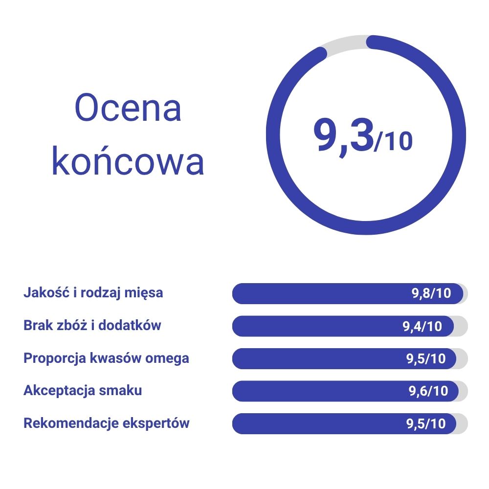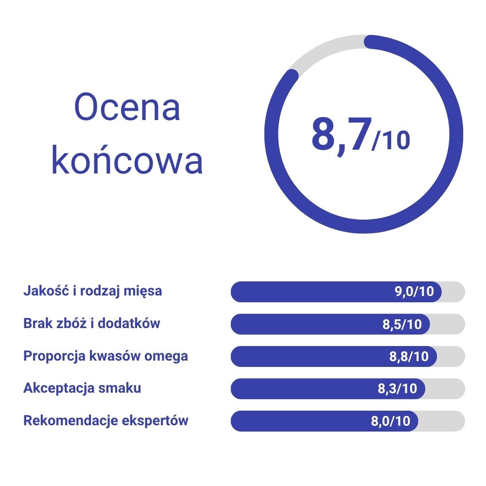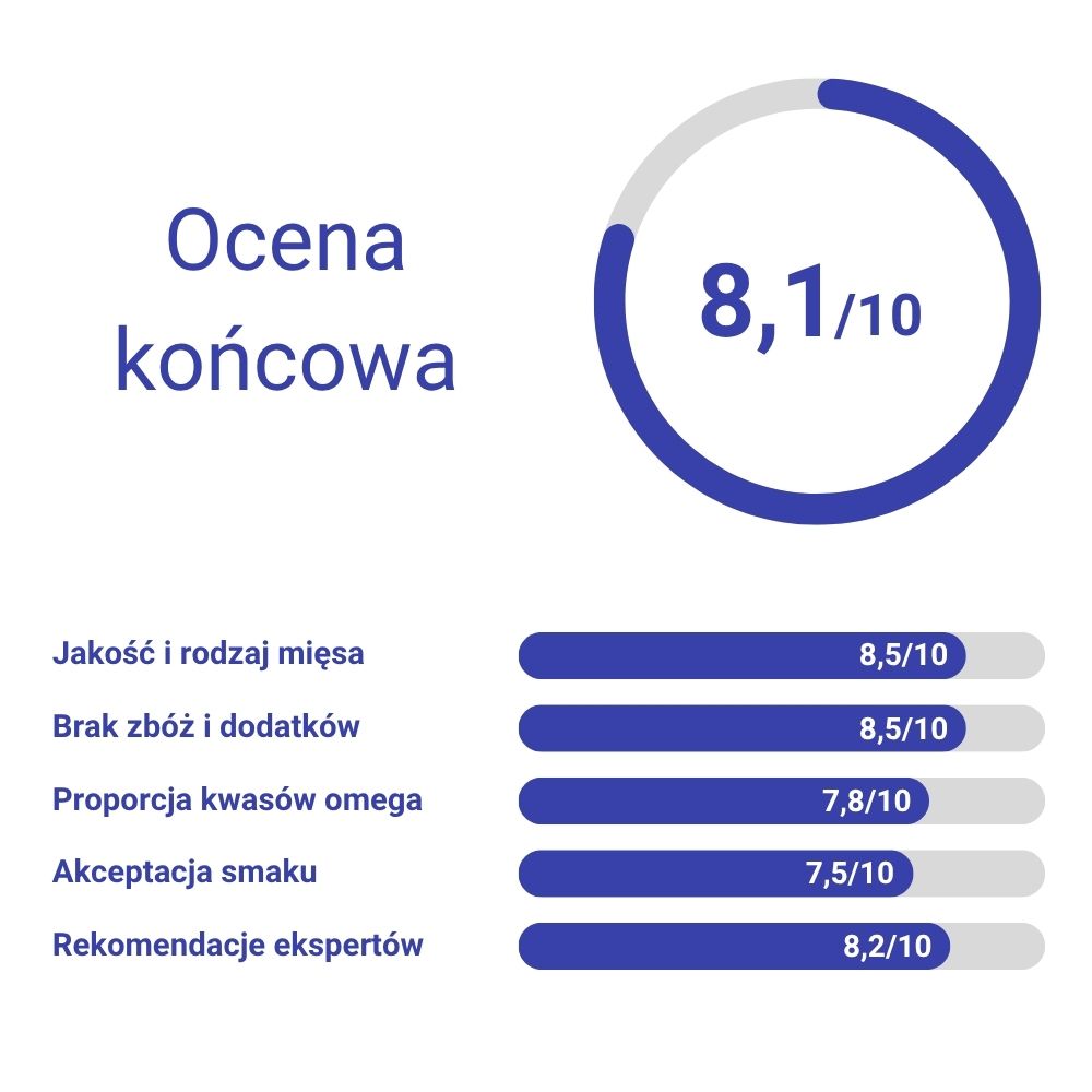 Jednocześnie udział składników zwierzęcych wynosi ok. 50%, co jest wynikiem wyraźnie lepszym niż w karmach zbożowych, ale nadal niższym niż w topowych produktach z wysoką zawartością mięsa.