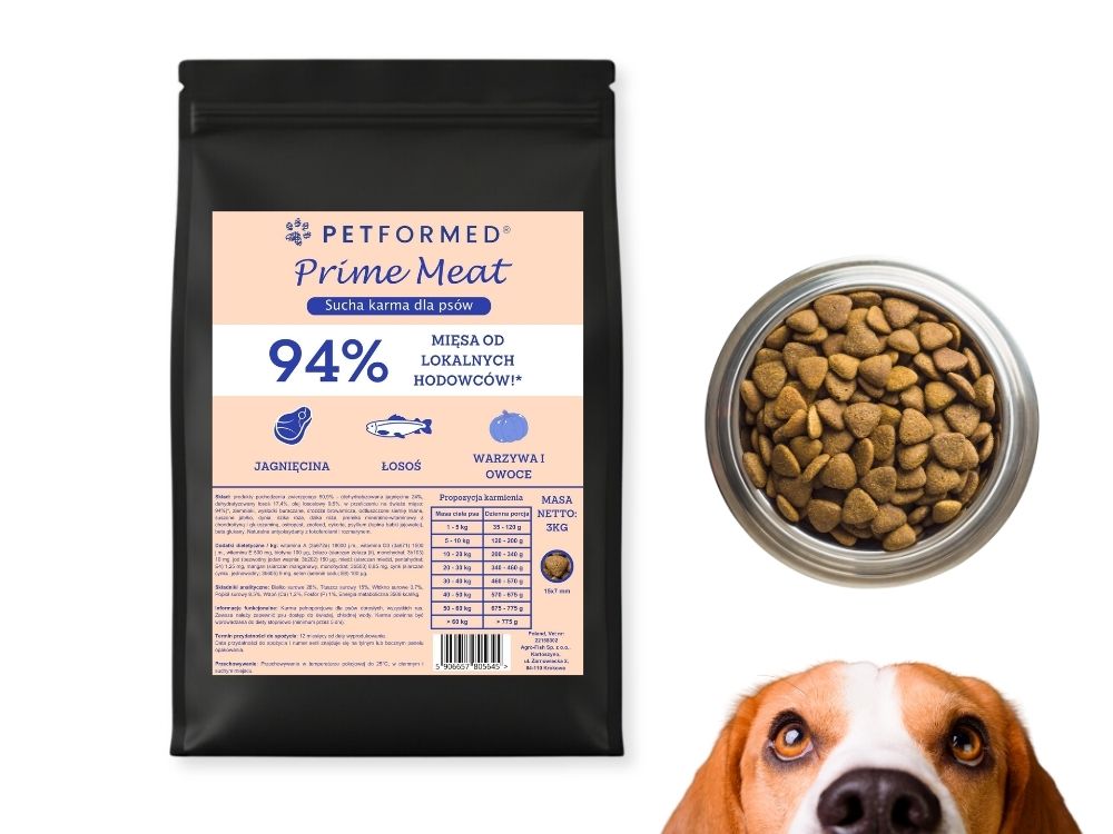 Petformed Prime Meat, dzięki wysokiemu udziałowi oleju łososiowego i suszonego łososia, osiąga proporcję zbliżoną do zalecanej przez specjalistów — co bezpośrednio przekłada się na lepszą kondycję skóry, sierści i odporności.