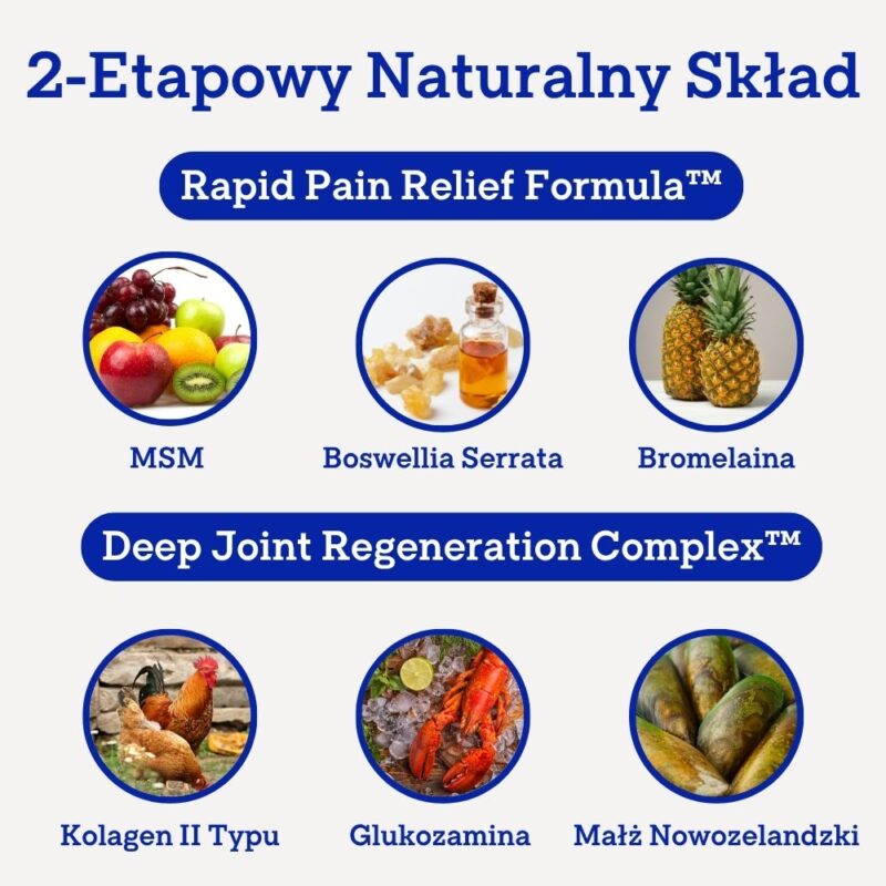 Faza 2: Deep Joint Regeneration Complex™ – Zestaw składników budulcowych, które stopniowo odbudowują tkankę chrzęstną i poprawiają nawilżenie stawów. Efekty są widoczne po 2-3 miesiącach regularnego stosowania.
