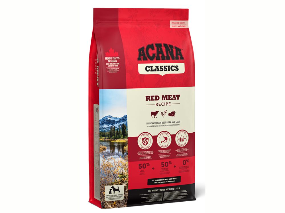 ACANA Classics Red Meat to karma od kanadyjskiego producenta Champion Petfoods, oparta wyłącznie na czerwonym mięsie — wołowinie, jagnięcinie i wieprzowinie. Zero kurczaka, zero tłuszczu drobiowego, zero jakichkolwiek składników z drobiu. Dobry wybór dla psów, które nie reagują na zboża, ale potrzebują diety bez kurczaka.