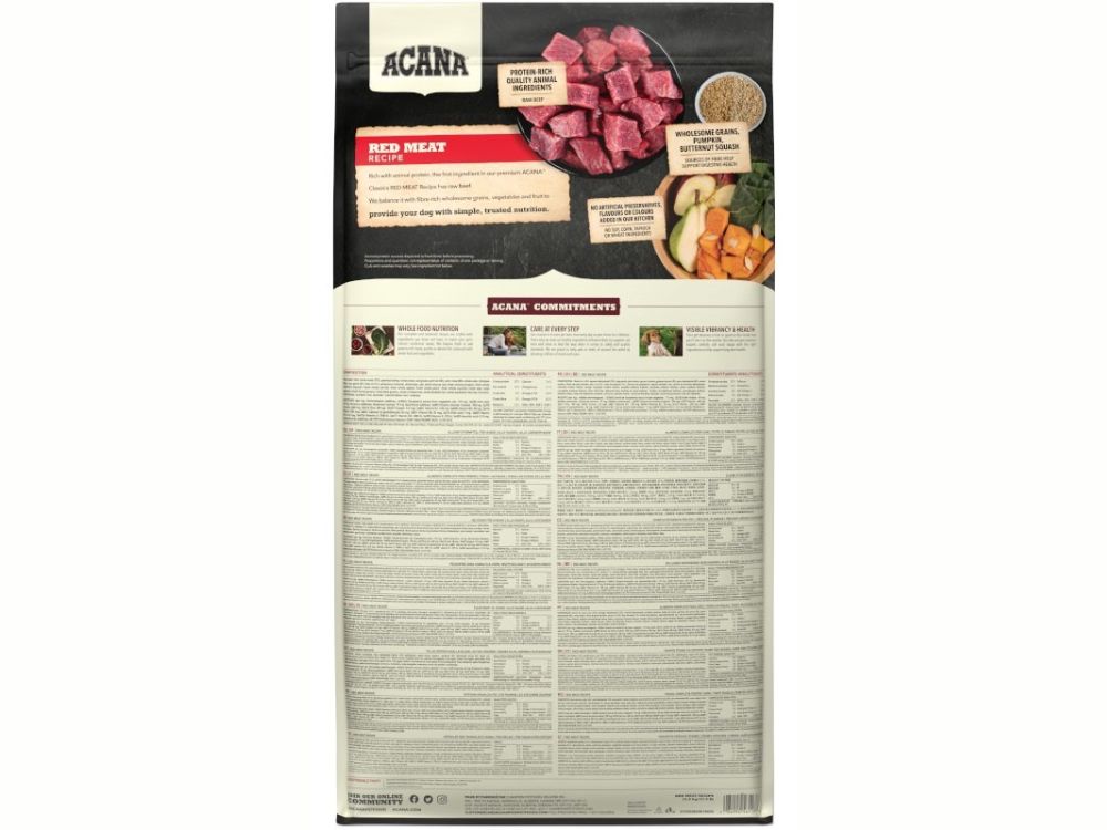 Ranking zamyka ACANA Classics Red Meat — karma oparta na trzech gatunkach czerwonego mięsa bez żadnego składnika drobiowego. Zawiera zboża o niskim indeksie glikemicznym, dlatego sprawdzi się u psów, które nie mają nietolerancji zbóż, ale reagują na kurczaka.