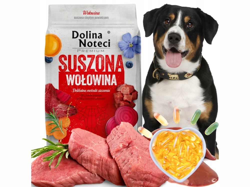Dolina Noteci Premium Suszona Wołowina (3. miejsce) to polska karma suszona ciepłym powietrzem z wołowiną, wieprzowiną i dorszem — żadne z białek nie pochodzi z drobiu. Innowacyjna technologia suszenia zachowuje wartości odżywcze lepiej niż tradycyjna ekstruzja. Dobry wybór dla psów, które lubią urozmaicone białka i miękką teksturę.