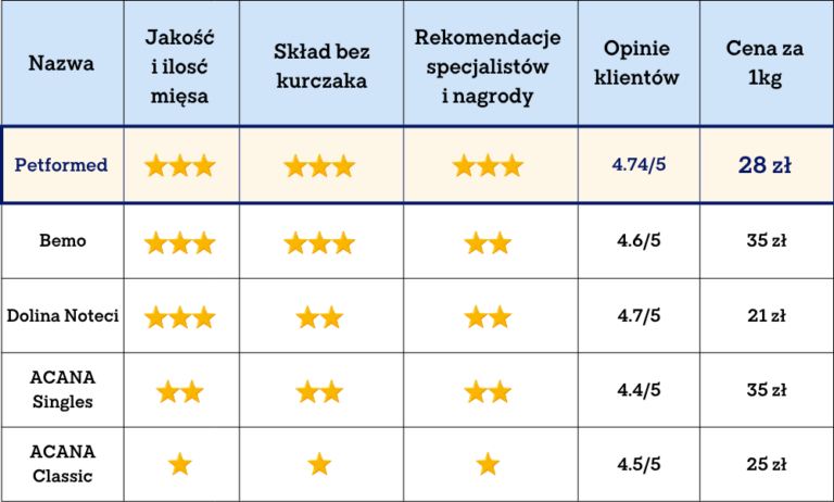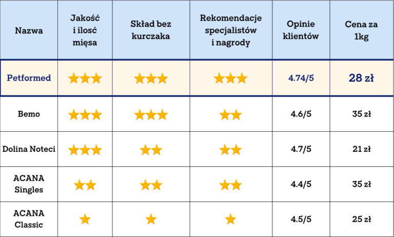 Przy wyborze kieruj się konkretną sytuacją: jeśli chcesz najlepszej jakościowo diety bez kurczaka dla zdrowego psa — Petformed. Jeśli pies ma potwierdzone alergie i potrzebujesz czystej monobiałkowej formuły bez kurczaka — Bemo lub ACANA Singles.