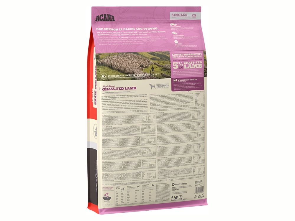 ACANA Singles Grass-Fed Lamb to bezzbożowa, monobiałkowa karma z jagnięciną z nowozelandzkich pastwisk – stworzona z myślą o psach z alergiami pokarmowymi i wrażliwym układem trawiennym. Jeden rodzaj białka zwierzęcego minimalizuje ryzyko reakcji alergicznej i pozwala precyzyjnie zdiagnozować nietolerancje pokarmowe.