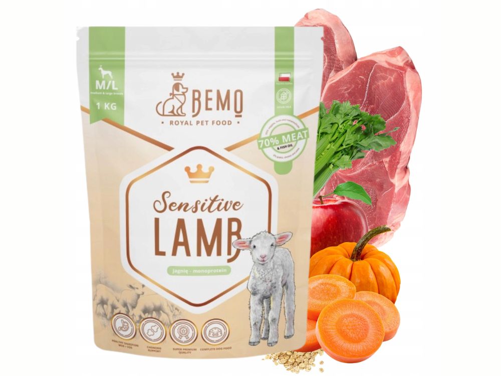 Na drugim miejscu Bemo Sensitive Lamb — najczystsza formuła hipoalergiczna z jednym źródłem białka, idealna dla owczarków z wieloma potwierdzonymi alergiami.