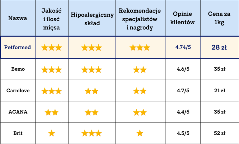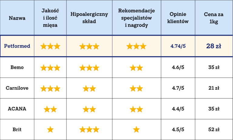 Niekwestionowanym liderem została Petformed Prime Meat, która łączy to, czego owczarki potrzebują najbardziej: brak uczulających białek, najwyższą zawartość mięsa dla utrzymania masy mięśniowej, wsparcie stawów i wrażliwego trawienia.